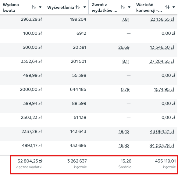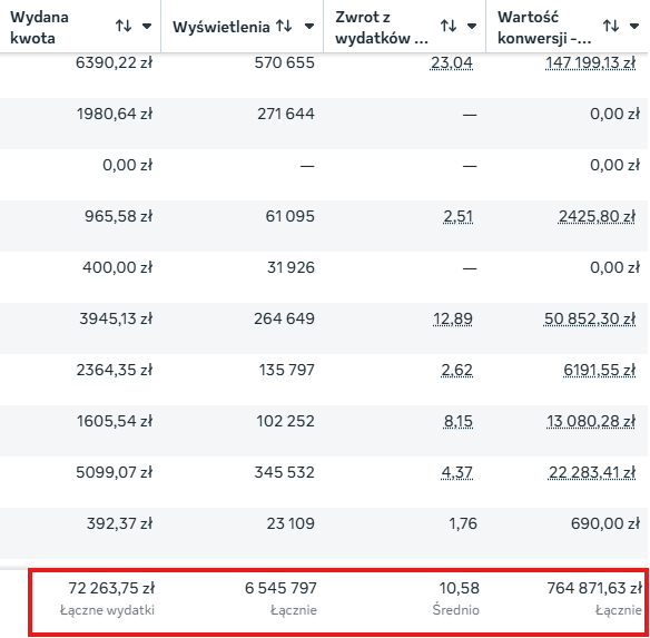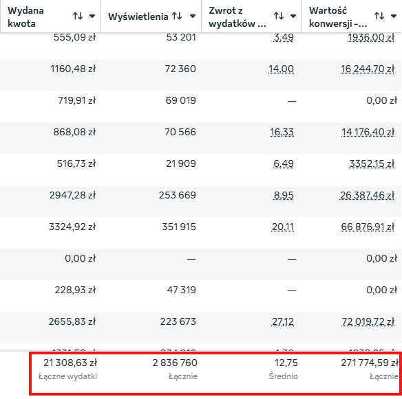 271 774 zł sprzedaży przy 21308,63 zł wydatków, co daje ROAS na poziomie 12,75.
