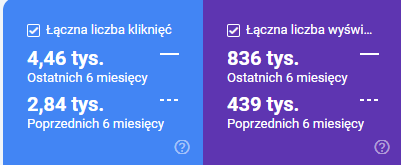 W ostatnich 6 miesiącach strona wygenerowała 4,46 tys. kliknięć z wyników organicznych. W poprzednich 6 miesiącach liczba kliknięć wynosiła 2,84 tys. W tym samym okresie liczba wyświetleń wzrosła z 439 tys. do 836 tys.